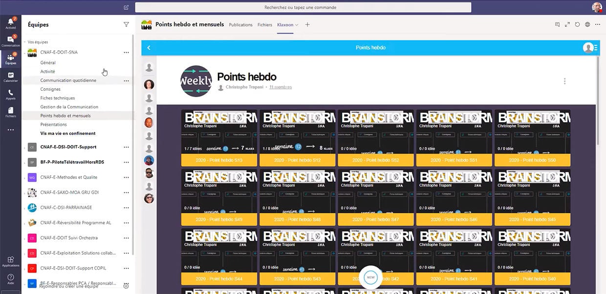 Directement sur Teams, dans son équipe Support Accueil National, Christophe a créé un canal “Points hebdo” au sein duquel il partage le Network Klaxoon. Le Network est un espace numérique de travail privé auquel chaque membre de l’équipe peut accéder très facilement et qui contient l’ensemble des activités Klaxoon que Christophe a déjà préparées pour les points hebdomadaires.