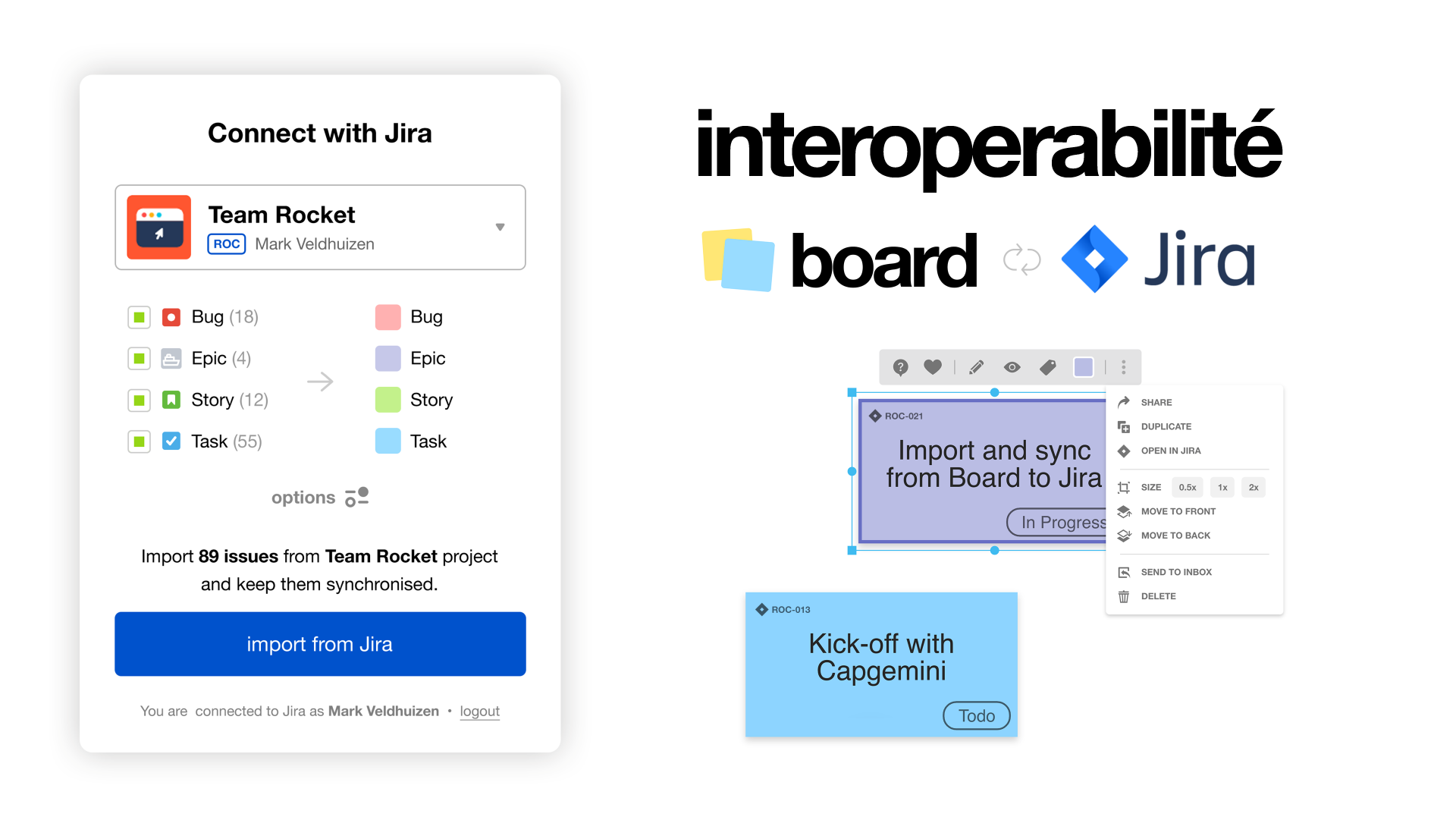 L'intégration de Klaxoon avec Jira vous permet notamment d'importer vos tickets Jira mis à jour directement dans Board, et inversement.