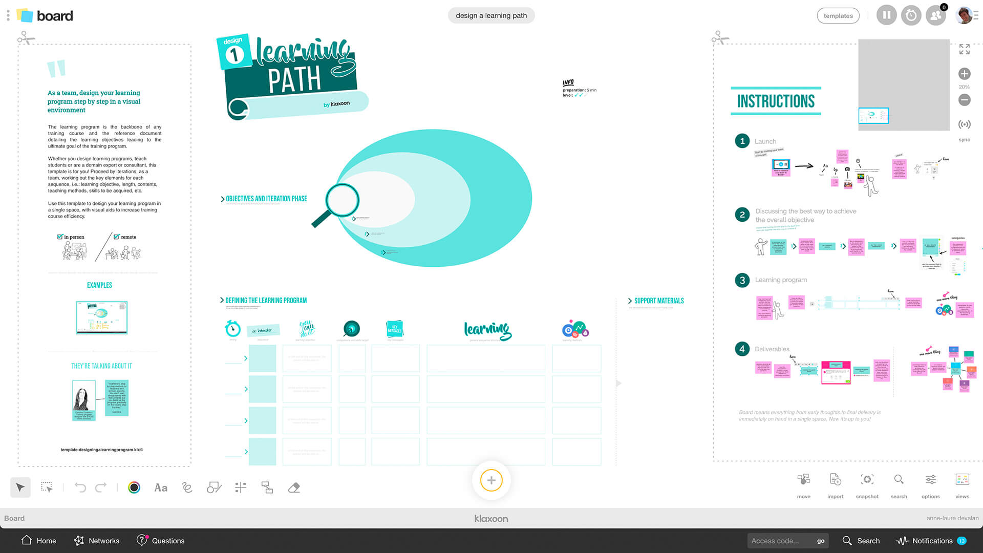 The Designing a learning path template makes training program design easy. It helps you bring together in a single place all of the training objectives, processes and teaching aids you will need. Training program designer, trainer or career expert, whatever your connection to the world of vocational training, with a visual management tool like the Building a Pedagogical Process template, it is now easy to define – as a team, step by step – the key components of your training sessions. Whether organized remotely, in the classroom or in hybrid mode, you and your team together can all participate in the design of the pedagogical process thanks to the functions of Board by Klaxoon (e.g. drawing, links, videos, pictures added to the dashboard). You’ll find training has never been so instructive!