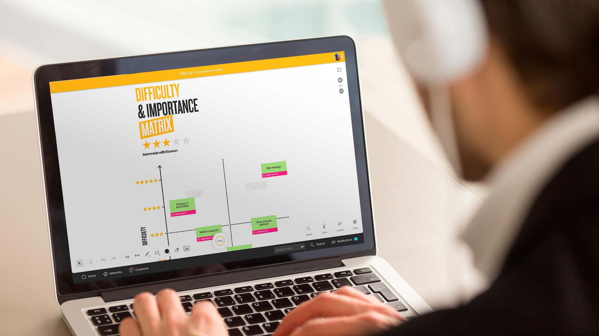 How do you prioritize tasks? As a team, rank them in order of importance, and then assess their feasibility. The simple visual design and features of Board, Klaxoon’s whiteboard, help you to work as a team easily, in person or remotely, to compare your data in the matrix. The horizontal axis represents the importance; the vertical axis represents the difficulty. This way, you can thus visualize priorities at a glance.