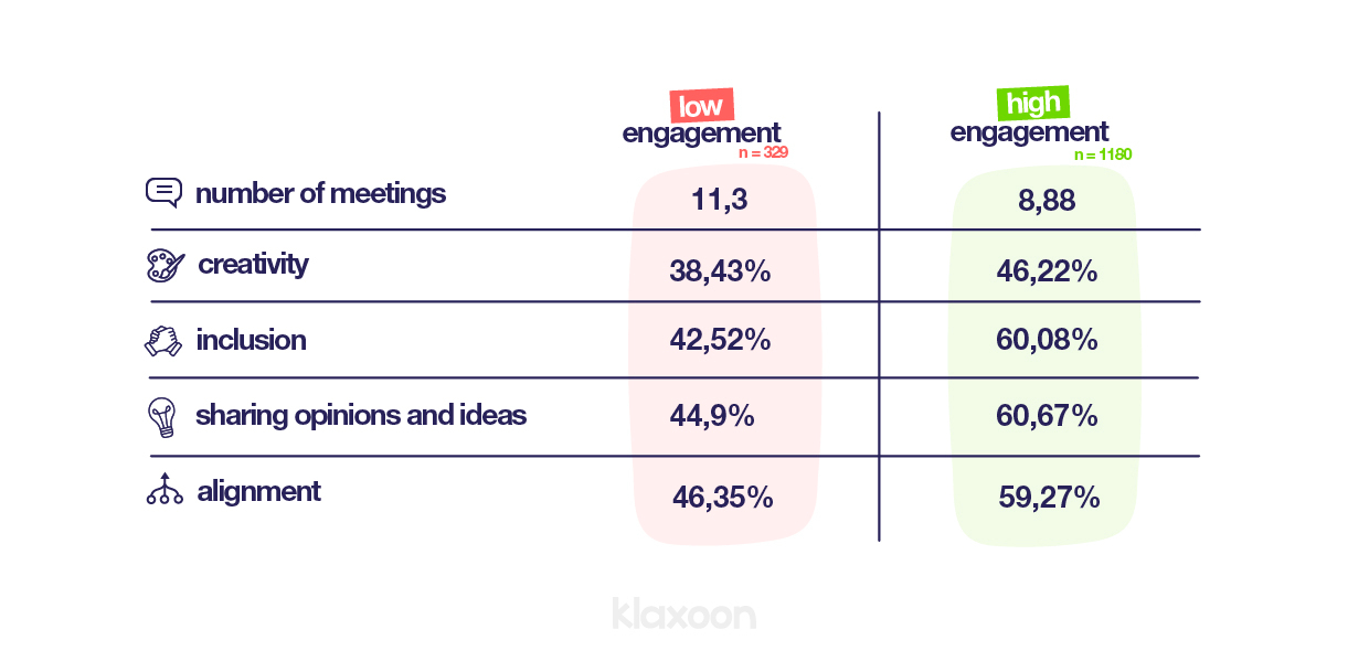 We can therefore say that the more surveyed people feel engaged in their meetings, the greater the sense of inclusion and alignment. Does this seem obvious to you?