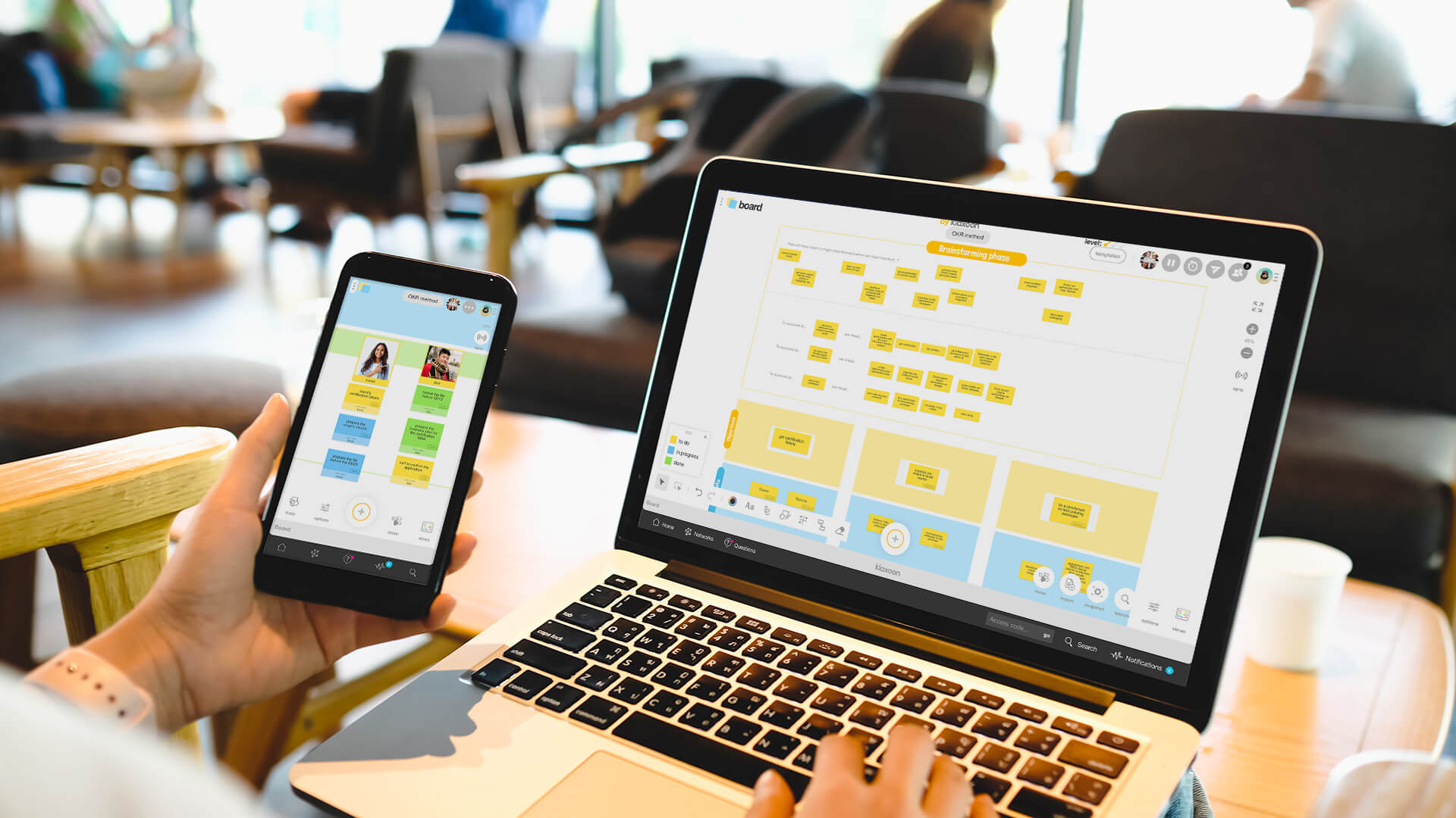 Board by Klaxoon is the ideal meeting place for you and your colleagues! It’s hybrid mode is a paragon of simplicity and efficiency. It features an OKR Template that allows you and your team mates to get together for a quick brainstorming session, a project update, to share your progress, or simply check what objectives have been reached. It’s built around an online whiteboard to which you have 24/7 access, not only during meetings. It’s thus an ideal tool for asynchronous meetings too (meaning unscheduled, random meetings when not all members are present).
