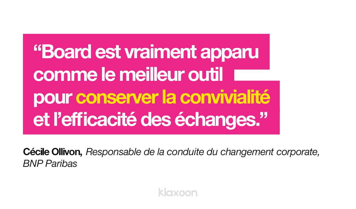 Comment organiser un workshop d’idéation et récolter les idées de 16 managers de manière efficace, même à distance ? Cécile Ollivon, Responsable de la Conduite du Changement chez BNP Paribas, pourrait y répondre. Elle construit avec les managers du secteur bancaire, des ateliers pour transformer leurs méthodes de travail. Entre volonté de rassembler et nouvelles méthodes de management qui intègrent de plus en plus le distanciel, elle fait le choix d’une solution de collaboration hybride, en accord avec les nouvelles revendications des collaborateurs : 8 sur 10 souhaitent en effet conserver une alternance entre présentiel et télétravail. Pour y parvenir, Cécile a choisi le Board Klaxoon : un outil idéal pour brainstormer en mode hybride.