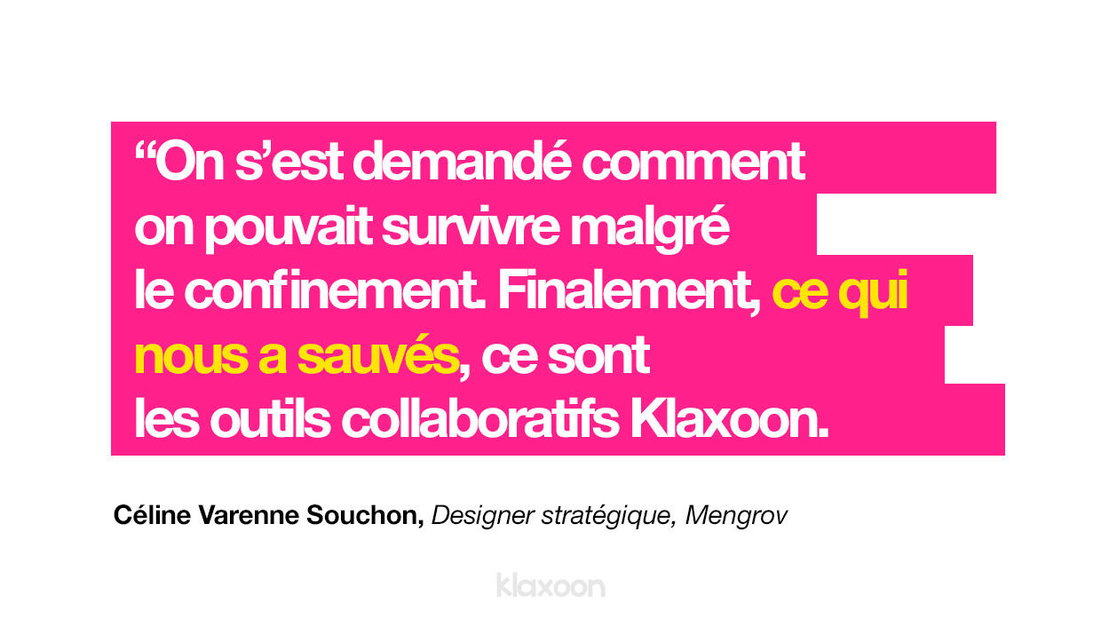 Céline Varenne Souchon est la fondatrice de l’agence Mengrov, spécialiste du design à impact, basée à Lyon. Dans son activité, l’agence a l’habitude d’animer des collectifs pour concevoir de nouveaux projets. En mars 2020, à l'annonce du confinement, Céline doit repenser ses méthodes de travail, notamment en ce qui concerne l’animation de collectifs.