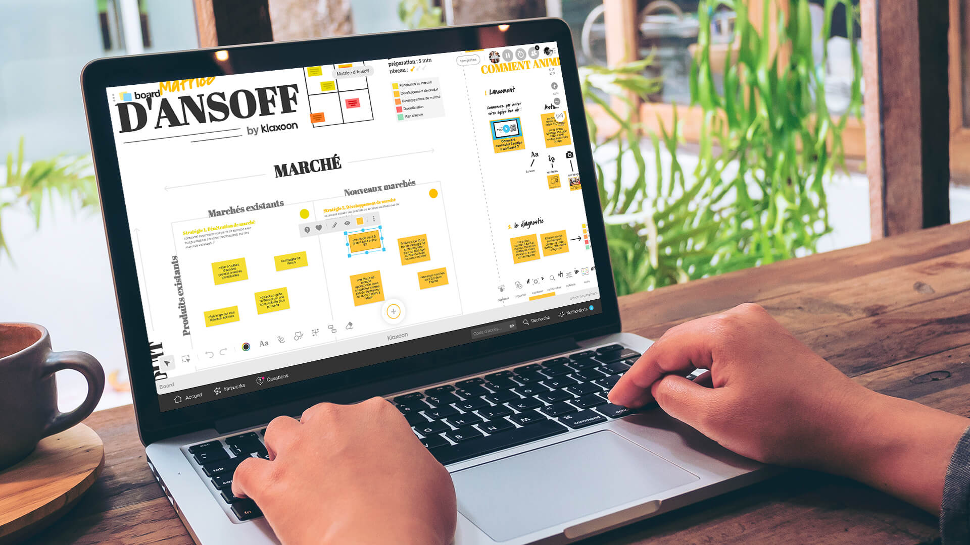 L’animateur du workshop commence par inviter tous les collaborateurs concernés sur le Board. Le tableau apparaissant au centre est la matrice d’Ansoff en elle-même. Elle combine les facteurs « produit » et « marché » avec les états « nouveau » et « existant », ce qui permet d’obtenir quatre stratégies d’Ansoff différentes.