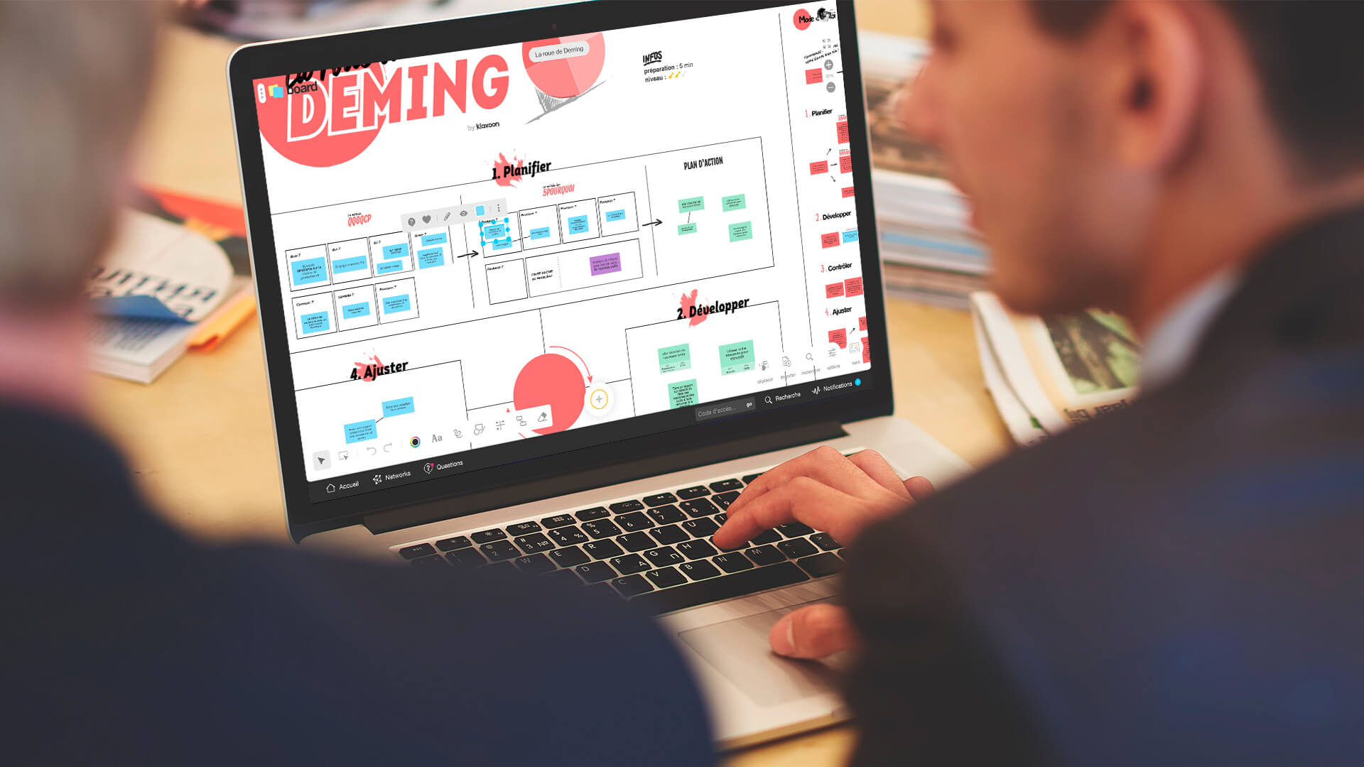 Outre le fait que la roue de Deming, ou la démarche PDCA, peut s’appliquer à tous les secteurs d’activité, le template Klaxoon vous permet de l’utiliser avec tous types d’équipes, même les plus grandes et travaillant de façon hybride. En salle, en déplacement ou en télétravail, le whiteboard de Klaxoon vous offre toute la liberté de faire tourner la roue depuis n’importe où.