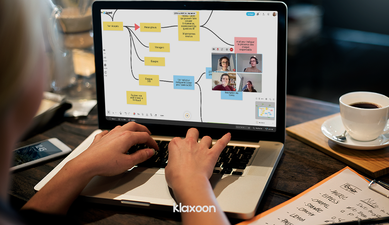 Marc crée un Board Klaxoon, un whiteboard digital collaboratif à l’espace infini, qu’il partage avec ses collègues et sa hiérarchie. Son équipe est donc capable de travailler de manière connectée, en partageant idées, méthodes, réalisations et résultats. Le but est de favoriser une vraie synergie au sein de son équipe.