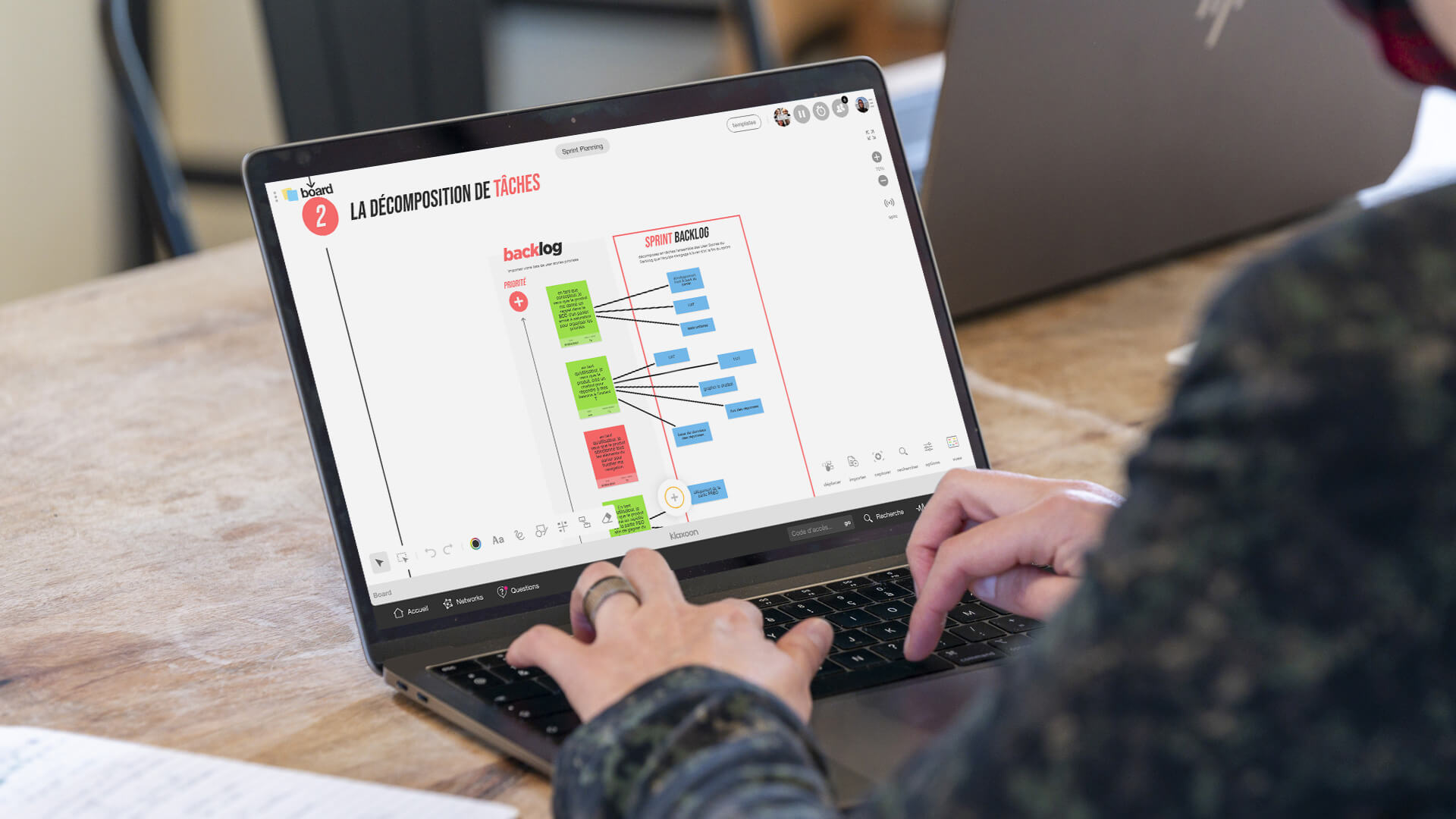 Le Product Owner entre en jeu en copiant-collant les user stories que vous aurez déjà définies grâce au template Product Backlog, ou bien en les important depuis un tableur. Chronométrez, grâce au timer situé en haut de votre board, une session de 45 min de questions-réponses sur les fonctionnalités à développer et à améliorer, puis choisissez en équipe celles à conserver pour votre sprint. Passez-les dans une autre couleur afin de les faire ressortir puis demandez à l’équipe développement de les décomposer en plusieurs tâches. Il s’agit de lister toutes les actions nécessaires pour rendre la fonctionnalité livrable, puis de les passer dans la partie Sprint Backlog et de les relier à chaque user story concernée via les connecteurs.