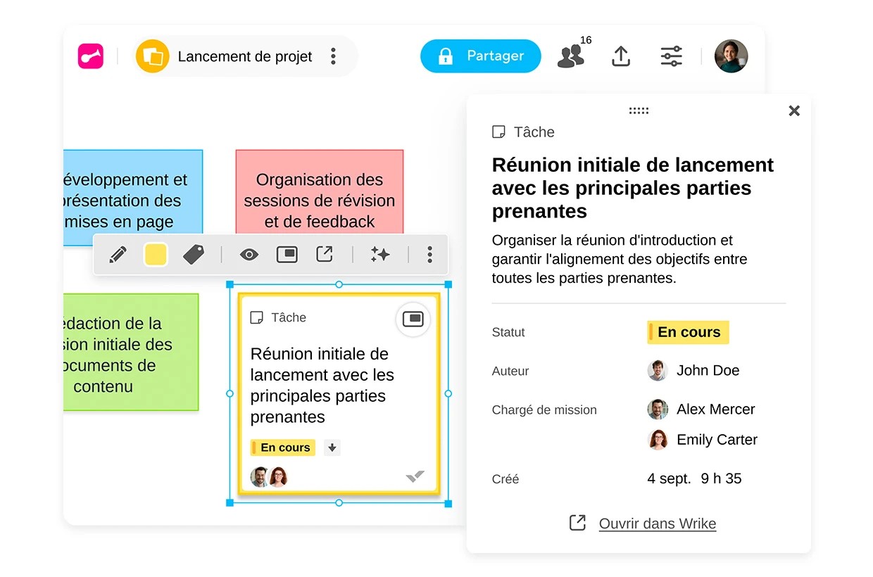Cette intégration simplifie le passage entre la collaboration visuelle et l’organisation du travail. Que vous fassiez un brainstorming sur Klaxoon ou que vous gériez des projets dans Wrike, tout reste synchronisé. Plus besoin de copier-coller, votre équipe peut se concentrer sur l’essentiel.