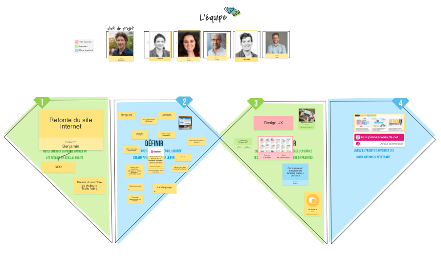 Vous voudrez également utiliser le management visuel dès que possible, afin de mieux organiser la réflexion des participants d'une manière dynamique mais facile à comprendre. Une plateforme en ligne capable de gérer la collaboration en direct peut être utile pour les équipes situées à distance, ainsi que pour inclure d'autres parties prenantes qui ne se trouvent peut-être pas dans le même bureau que vous.